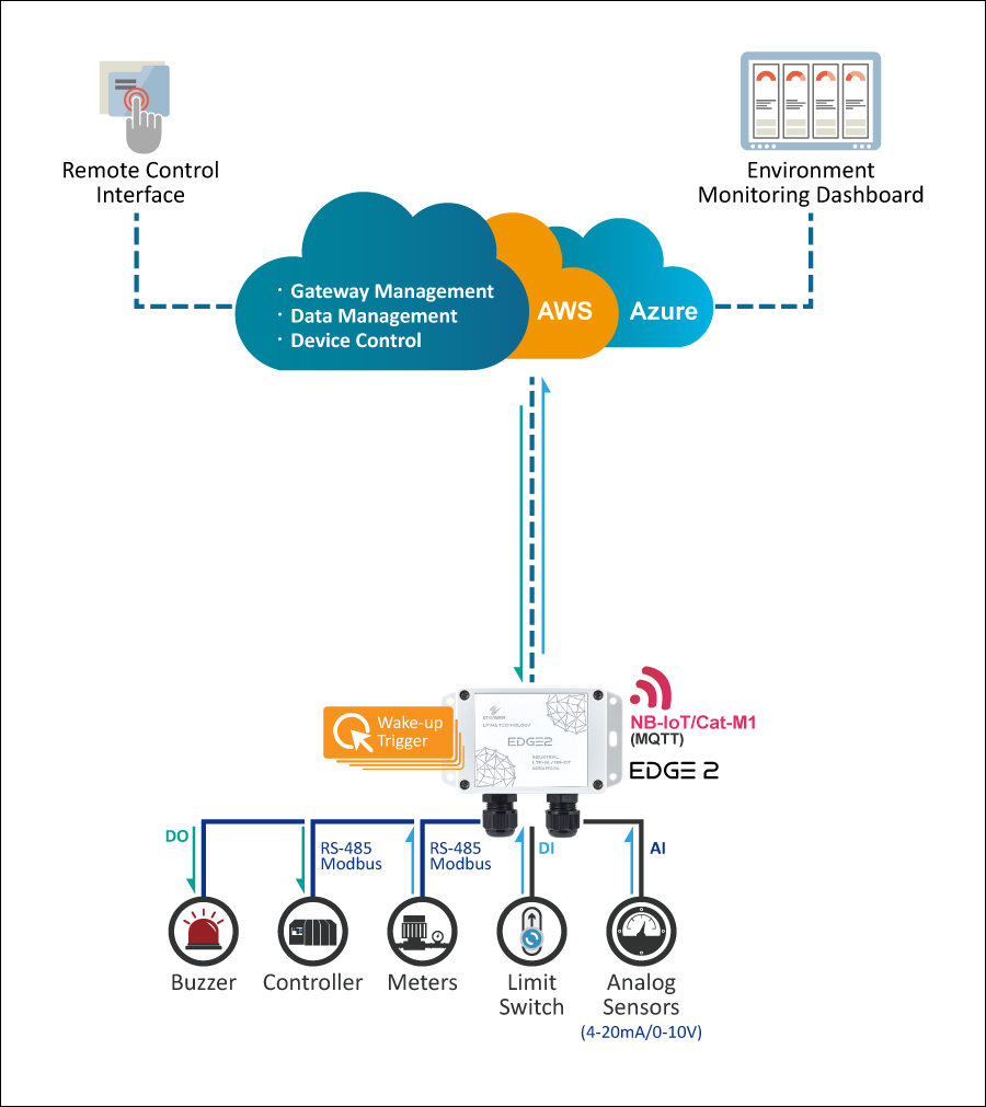 Produkty z serii EDGE2 firmy EtherWAN oferują prosty i skalowalny sposób przyspieszenia wdrożeń IoT w inteligentnych rozwiązaniach przeciwpowodziowych. Zapewniają one stabilne i działające w czasie rzeczywistym bezprzewodowe rozwiązania LPWA (Low Power, Wide Area): urządzenia LTE NB-IoT/Cat-M1 są rozmieszczone w różnych punktach obserwacyjnych i monitorujących w celu zbierania danych z czujników końcowych. Wymagając jedynie podstawowej konfiguracji, sieć NB-IoT/Cat-M1 pozwala na szybkie i stabilne przesyłanie dane z czujników terenowych/urządzeń szeregowych do back-endowego systemu zarządzania.
